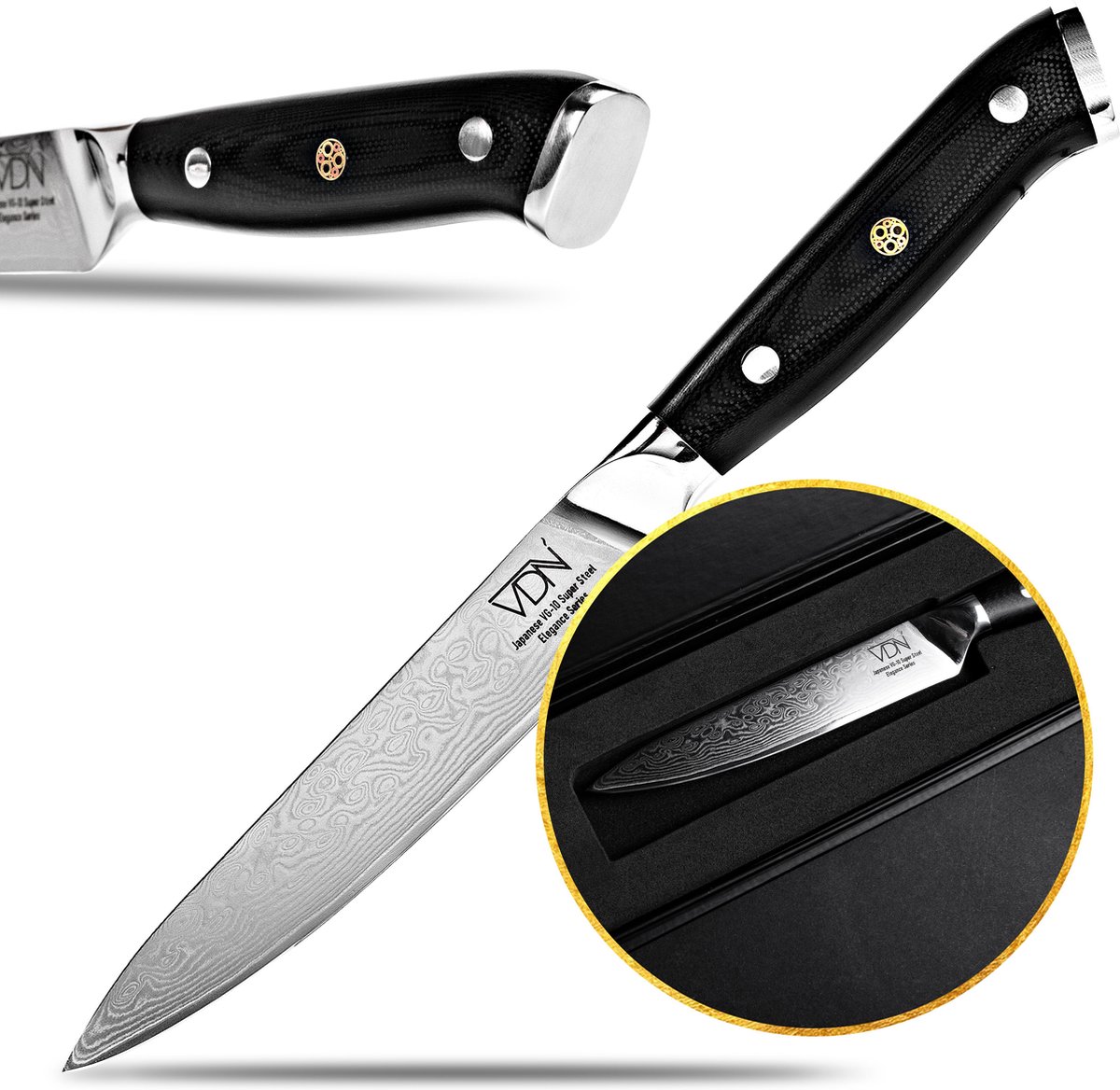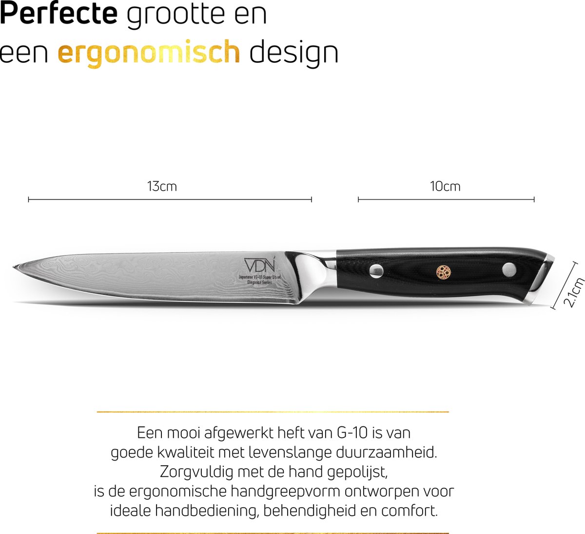 Overzicht:De VDN Elegance-serie zijn hoogwaardige keukenmessen voor Nederlandse thuiskoks die scherpte en stijl zoeken. Elk lemmet heeft een kern van VG-10-staal (60–62 HRC) en is omhuld met 66 lagen damaststaal.
