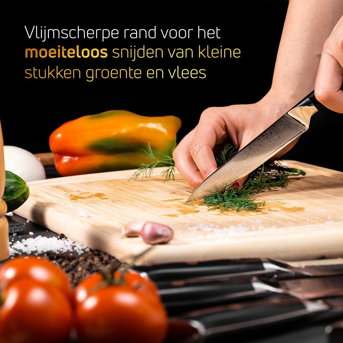 Het vermelde utility mes met een toelopende, vlijmscherpe rand is nuttig voor het snijden van kleinere stukken vlees en groenten. De combinatie van hard snijstaal en een flexibelere damastlage geeft een goede mix van snijprecisie en taaiheid. Voor gebruikers die moeten fileren, snijden of fijnwerk verrichten in de keuken, is dit type mes praktisch inzetbaar.