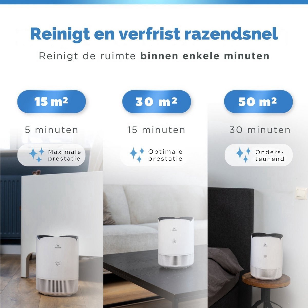 Compact en lichtgewicht (1,85 kg) — makkelijk verplaatsbaar | Ideale dekking van 30 m² is richtlijn; grootschaligere ruimtes hebben meerdere units nodig |