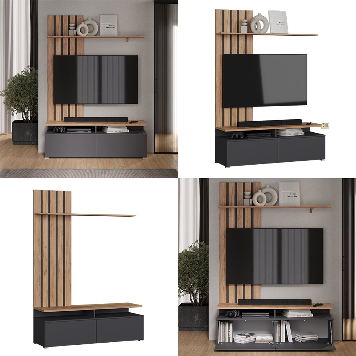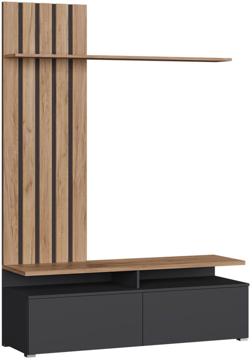 Het Harro wandmeubel is een vrijstaand wandmeubel dat speciaal ontworpen is om zowel opslagruimte als een stijlvolle uitstraling aan je woonruimte te geven. Met een combinatie van Goldkraft eiken en antraciet biedt het meubel een moderne, maar warme look die goed samengaat met uiteenlopende interieurstijlen.