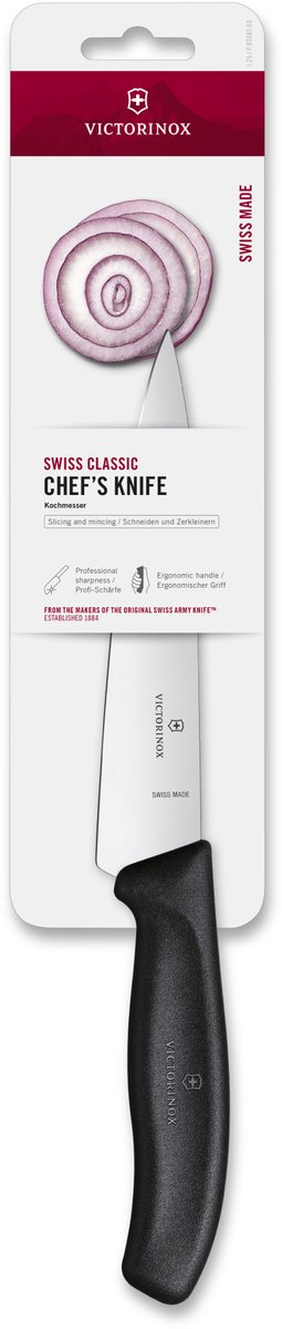 Het Victorinox Swiss Classic koksmes is een veelzijdig keukenmes met een 15 cm lang lemmet, ontworpen voor dagelijkse snijtaken van groente en vlees tot fijner werk zoals hakken van kruiden. Het combineert een roestvrijstalen lemmet met een zwart fibrox-handvat en wordt geleverd in een blisterverpakking.