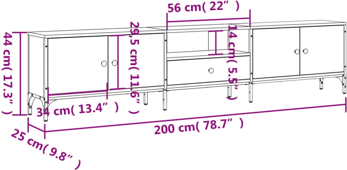 Afmetingen: 200 x 25 x 44 cm (L x B x H) — dit betekent een opvallend lange maar smalle kast, ideaal voor brede televisies of als dressoir tegen een lange wand. De geringe diepte van 25 cm maakt het meubel geschikt voor smalle gangen of kamers waar vloeroppervlak beperkt is (bron: listing, checked 2025).