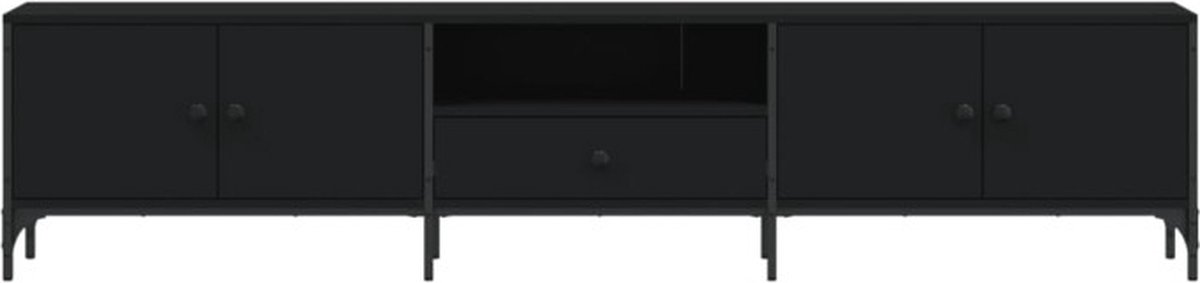 Dit zwarte tv-meubel combineert een modern, doch praktisch ontwerp met materialen die zijn bedoeld voor dagelijks gebruik. Het meubel is opgebouwd uit bewerkt hout met een metalen frame en biedt gesloten opbergruimte achter deuren, een stevig bovenblad en verstelbare poten voor stabiliteit op ongelijke vloeren.