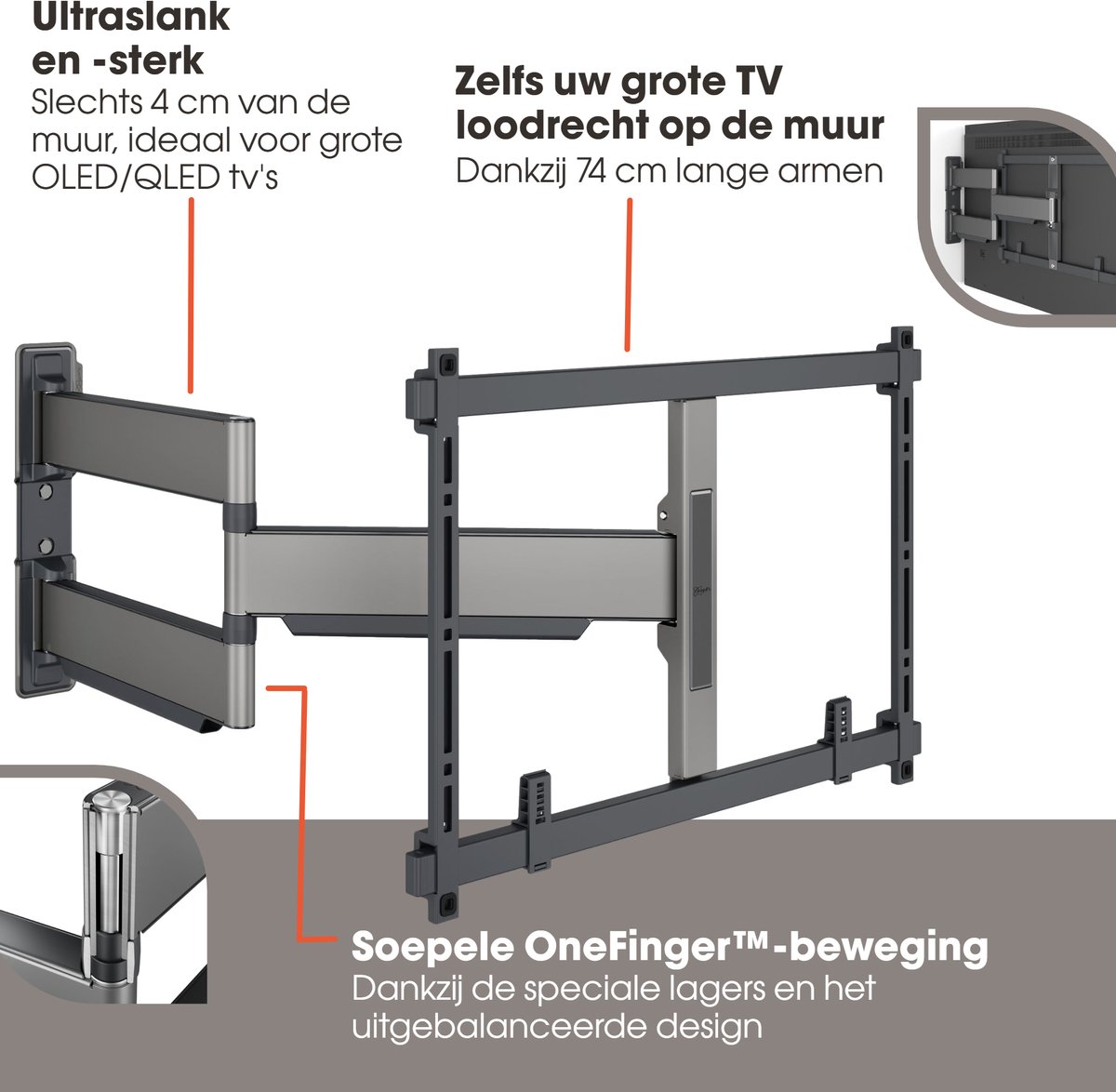 De Vogel’s ELITE Full-Motion+ tv-beugel is een uitgekiende keuze voor wie een grote tv strak tegen de muur wil hangen zonder aan flexibiliteit of veiligheid in te boeten. Met een ultraslank profiel, TÜV-certificering, eenvoudige One-Finger™ bediening en geïntegreerd kabelbeheer is dit een professioneel uitgevoerde oplossing voor high-end tv’s (Vogel’s ELITE Full-Motion+ tv-beugel). Controleer wel altijd het gewicht en de VESA-specificaties van jouw televisie voordat je bestelt en houd rekening met het ontbreken van kantelfunctie.