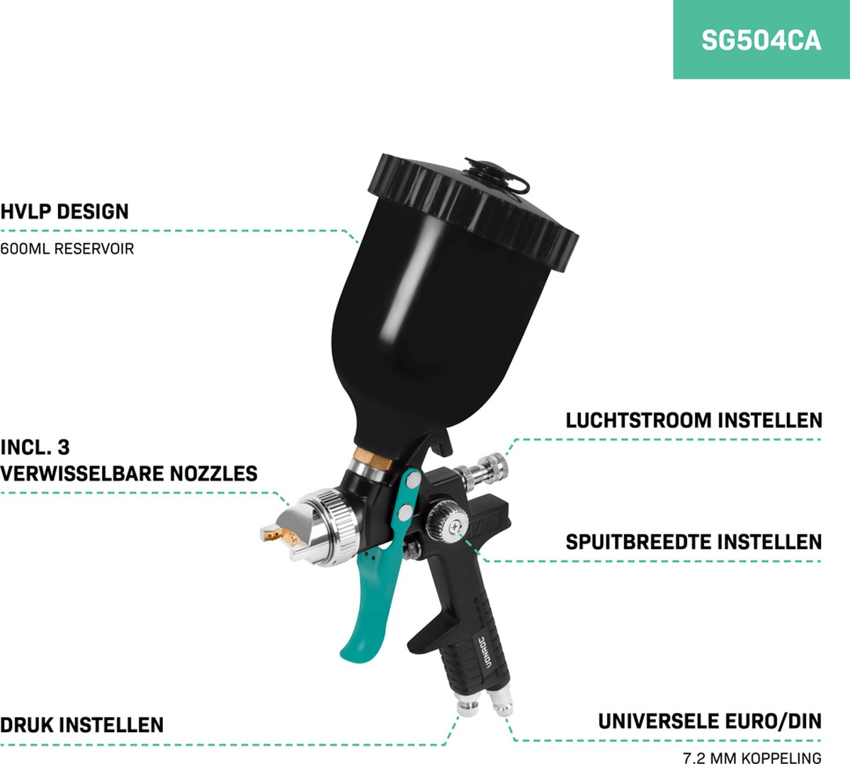 De ergonomie is functioneel: de trekker en instellingen zijn goed bereikbaar en de 360° draaibare kop (aircap) helpt om het spuitpatroon precies te sturen in de richting die jij wilt, zonder dat je jezelf in lastige bochten hoeft te wringen. De universele EURO/DIN 7,2 mm koppeling zorgt voor vlotte aansluiting op de meeste gangbare luchtsystemen; je bent dus niet gebonden aan één merk of specifieke koppeling.