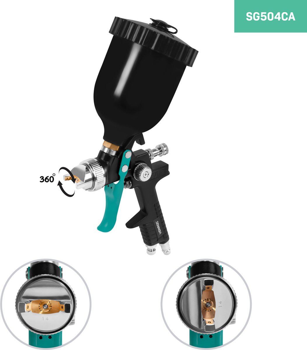 - Stel spuitbeeld nauwkeurig af met 360° draaibare luchtkap.