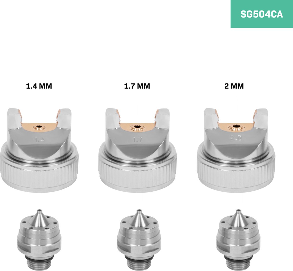 - Kies perfecte doorstroming met 3 spuitmonden: 1,4 / 1,7 / 2,0 mm.