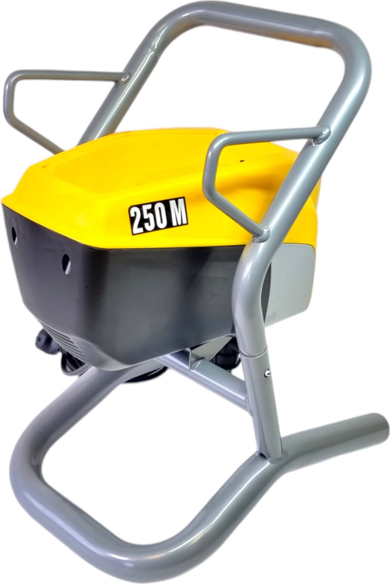 De Control Pro 250 M is gebouwd rondom een metalen frame dat direct als draaggreep dient. Dat maakt de machine stabiel op de vloer en eenvoudig te verplaatsen in de ruimte. Het frame voelt robuust aan, wat vertrouwen geeft als je hem meeneemt naar een projectlocatie of veel verplaatst tijdens het spuiten.
