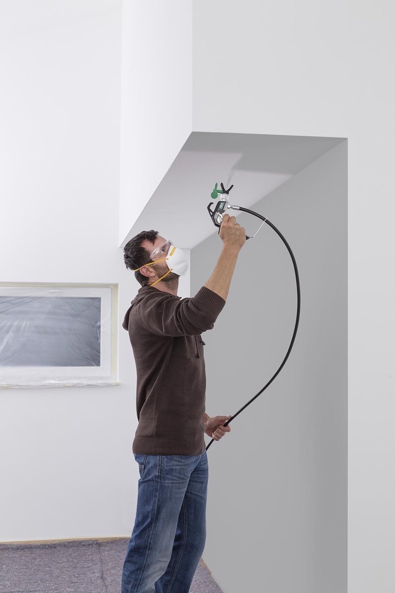 De behuizing van de machine is van kunststof. Dat houdt het totaalgewicht op een hanteerbare 7,1 kg en maakt het toestel goed draagbaar. De draaggreep bovenop helpt je de verfspuit eenvoudig te verplaatsen, bijvoorbeeld tussen ruimtes of naar een steiger. Het geheel is ontworpen als stationaire unit met slang en pistool, zodat je de basis kunt neerzetten en met het pistool rond het werkgebied beweegt.