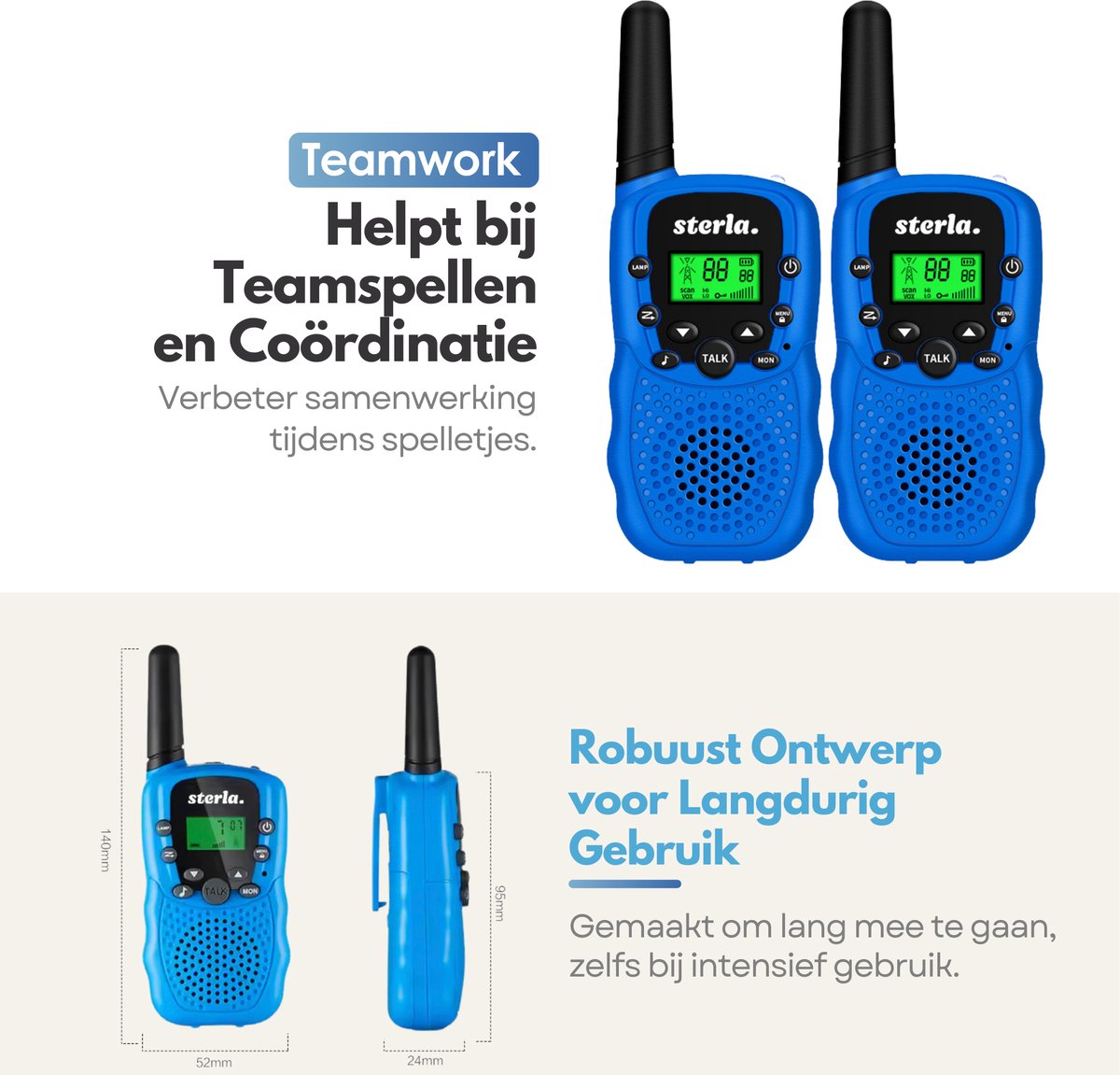 De Sterla walkie talkies zijn een set compacte, USB-oplaadbare portofoons ontworpen voor kinderen en gezinnen. Ze bieden eenvoudige push-to-talk communicatie, een lichtgewicht behuizing en een bereik dat volgens de fabrikant tot 3 km reikt. Het toestel is bedoeld voor buitenspelen, schoolreisjes, speurtochten en andere groepsactiviteiten waarbij directe, lokaal bereikbare communicatie handig is.