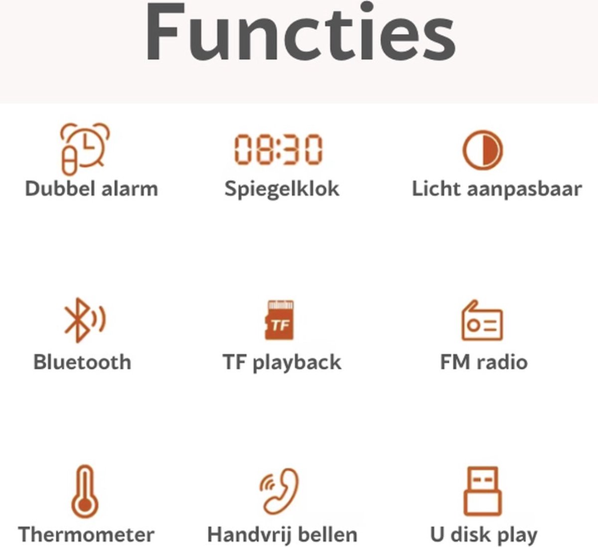 Eenvoudige, overzichtelijke functionaliteit voor gebruikers die geen complexe functies willen | Onbekend of er meerdere alarmtijden of geavanceerde wekinstellingen zijn |