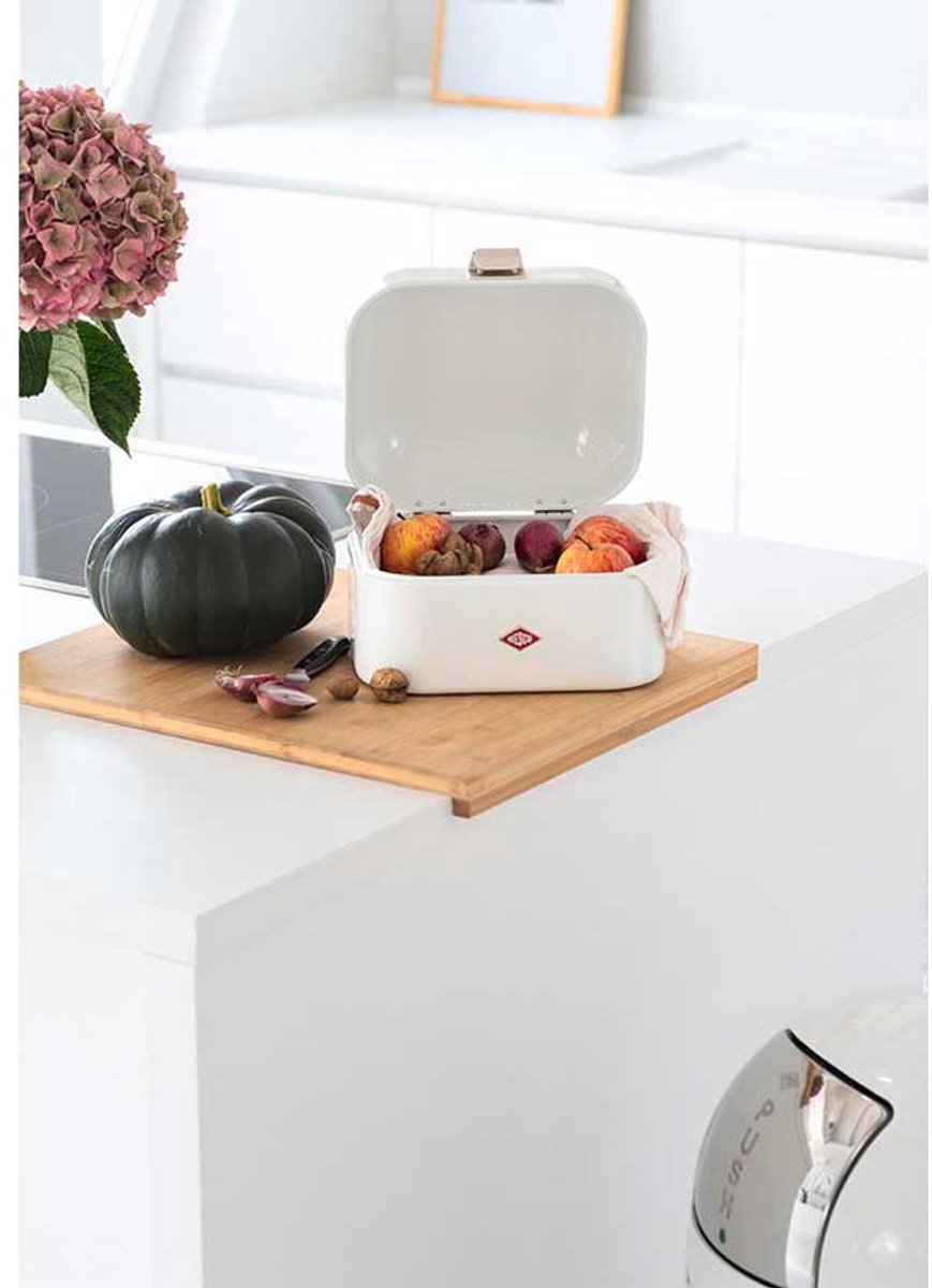 - In het dagelijks gebruik: Je plaatst de broodtrommel gemakkelijk naast de waterkoker of koffiemachine. Voor wie zijn aanrecht netjes wil houden, helpt de compacte broodtrommel om losse zakken brood en broodjes te bannen, waardoor je keuken rustiger oogt.