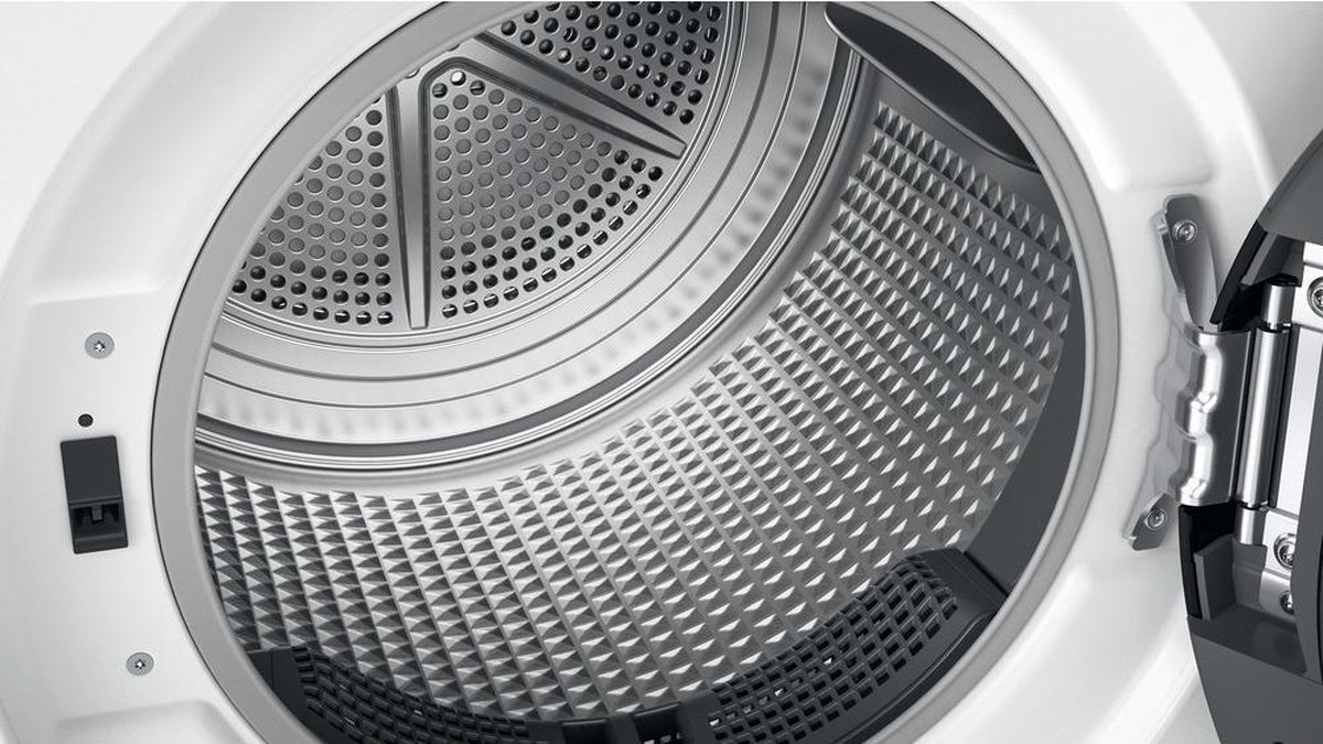 Het hart van deze droger is de 6th Sense technologie. Sensoren meten volgens de fabrikant doorlopend de restvochtigheid en passen de programmaduur daarop aan. Praktisch voordeel: geen gokwerk met tijden en minder risico op over- of onderdrogen. Stop je na een wasbeurt zowel handdoeken als T-shirts in de trommel, dan komen die stukken vaker gewoon goed droog en gelijkmatig eruit. Bovendien helpt dit de droogtijd en het energieverbruik te optimaliseren, omdat het programma stopt wanneer de sensoren vinden dat het droogniveau is bereikt.