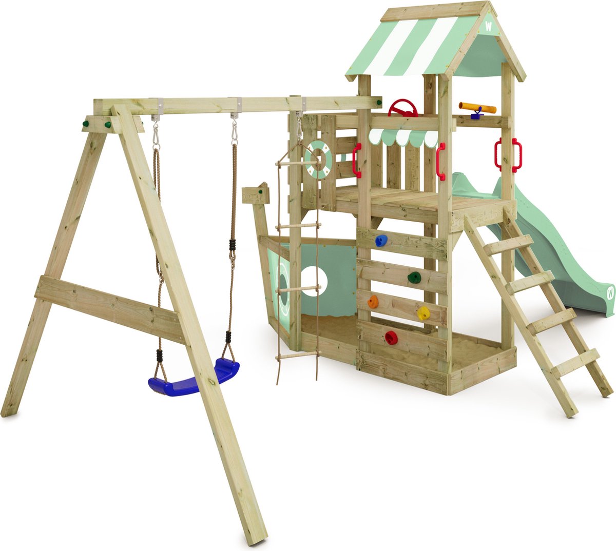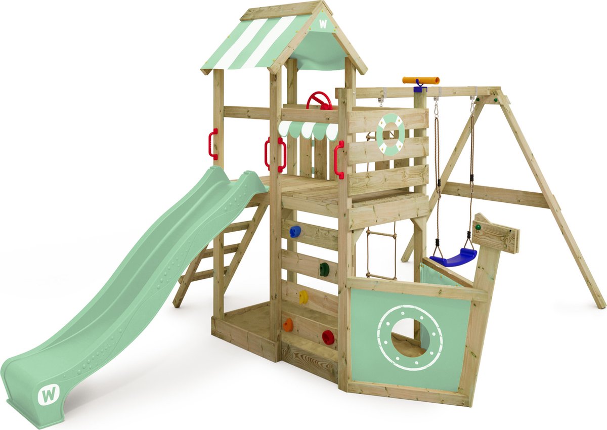 De Wickey SeaFlyer is een thematisch speelboot-speelconstructie die kinderen uitnodigt tot avontuurlijk en fantasierijk spelen. Het product beschrijft een schip met klim- en glijelementen, een touwladder en een schommelbalk die ruimte biedt voor een tweede schommel. Voor ouders die een speels middelpunt in de tuin willen met veel rollenspelpotentie, is dit concept aantrekkelijk.