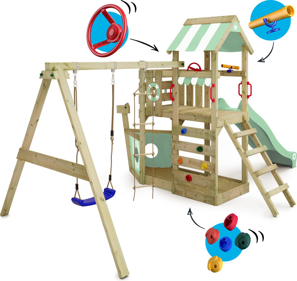 Overzicht:De Wickey SeaFlyer is een fantasierijk speeltoestel dat kinderen meeneemt naar Candy-eiland, ideaal voor Nederlandse gezinnen die buiten spelen waarderen. De schommelbalk is compatibel met een extra schommelhaak en schommelzitje, waardoor het toestel eenvoudig uitbreidbaar is.