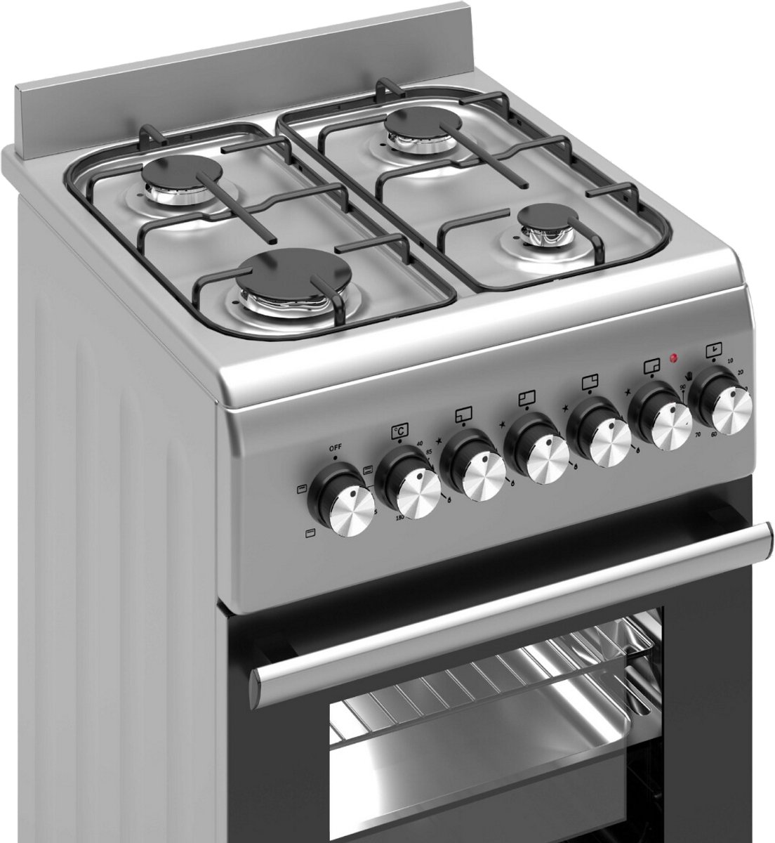 Ondanks zijn smalle behuizing is dit een volwaardig toestel voor dagelijks koken. Vier branders geven je altijd een logische indeling voor saus, groente, koolhydraat en hoofdcomponent. De elektrische oven met grill maakt het repertoire compleet: van crispy aardappelgratin tot sappige ovenschotels en gebak. Voor kleine huishoudens, stellen of gezinnen die compact willen wonen is dit precies het evenwicht tussen maat en mogelijkheden.
