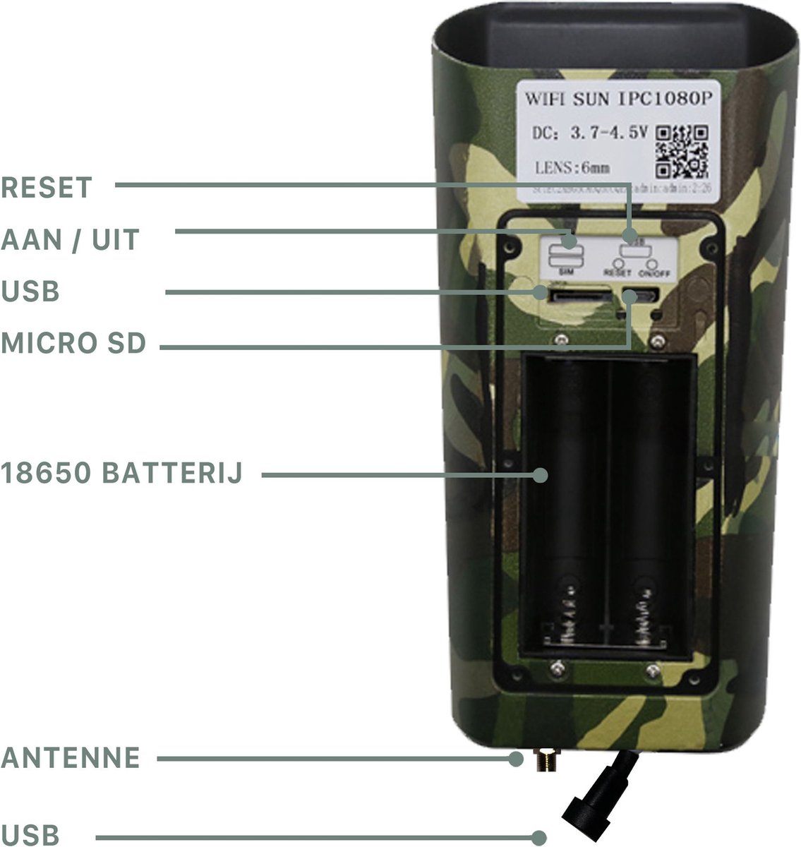 Batterijen en stroom: de camera werkt op 4× 18650 Flat Top-batterijen (minimaal 3000 mAh), die niet bijgeleverd worden. Omdat het apparaat ook via het zonnepaneel stroom krijgt, kun je lange periodes overbruggen zonder veel onderhoud — in de praktijk vergt dit wel dat je hoogwaardige oplaadbare batterijen gebruikt en deze periodiek controleert op corrosie of lekken.