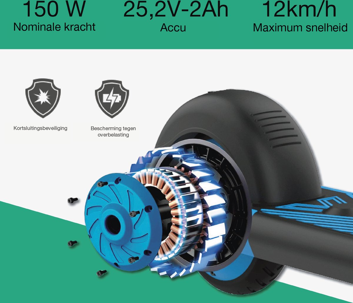 De step is bedoeld voor kinderen van 8–14 jaar en heeft een 150 W motor met een snelheidsbegrenzing tot 12 km/u. Dit biedt voldoende aandrijving voor rustig stad- of buurtgebruik zonder onnodig hoge snelheden die riskant kunnen zijn voor jonge rijders. (bron: listing, checked 2025)