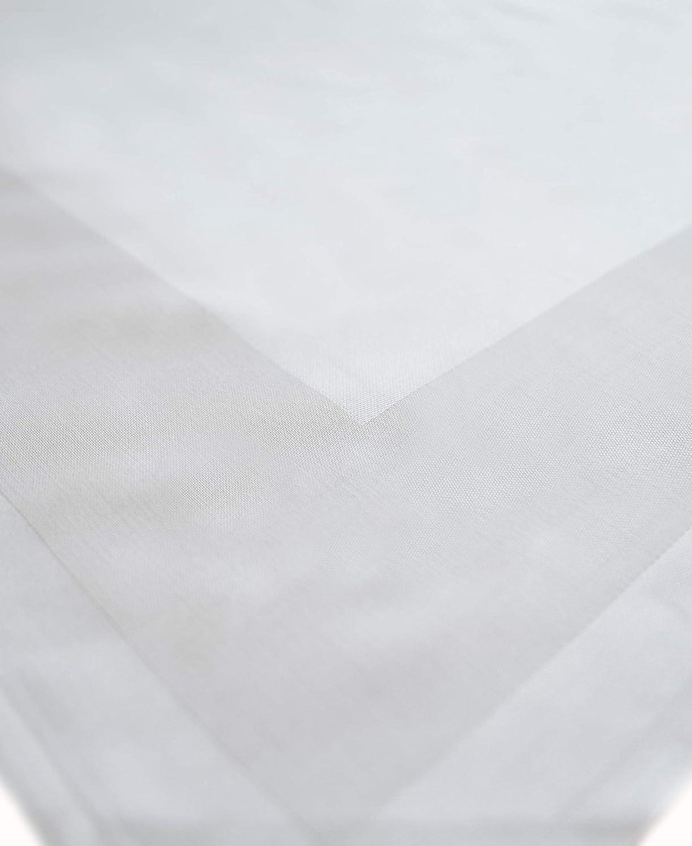 Het materiaal is 100% katoen met een fijn getwijnde kwaliteit. Die twijning zorgt doorgaans voor een dichter weefsel en een prettige, iets zachtere structuur dan standaard katoen. De afwerking bevat een 4-zijdige atlasrand — volgens de specificatie twee vaste geweven randen en twee zoomranden — wat de randen extra stevigheid en vormbehoud geeft.