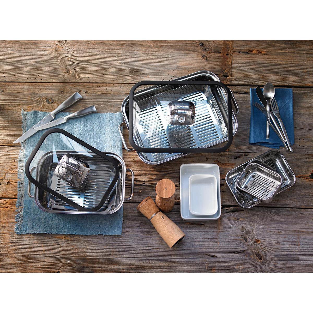 | Veelzijdig: stomen, stoven en braden in één pan | Het formaat (41 x 27 x 10 cm) vraagt de nodige opbergruimte |