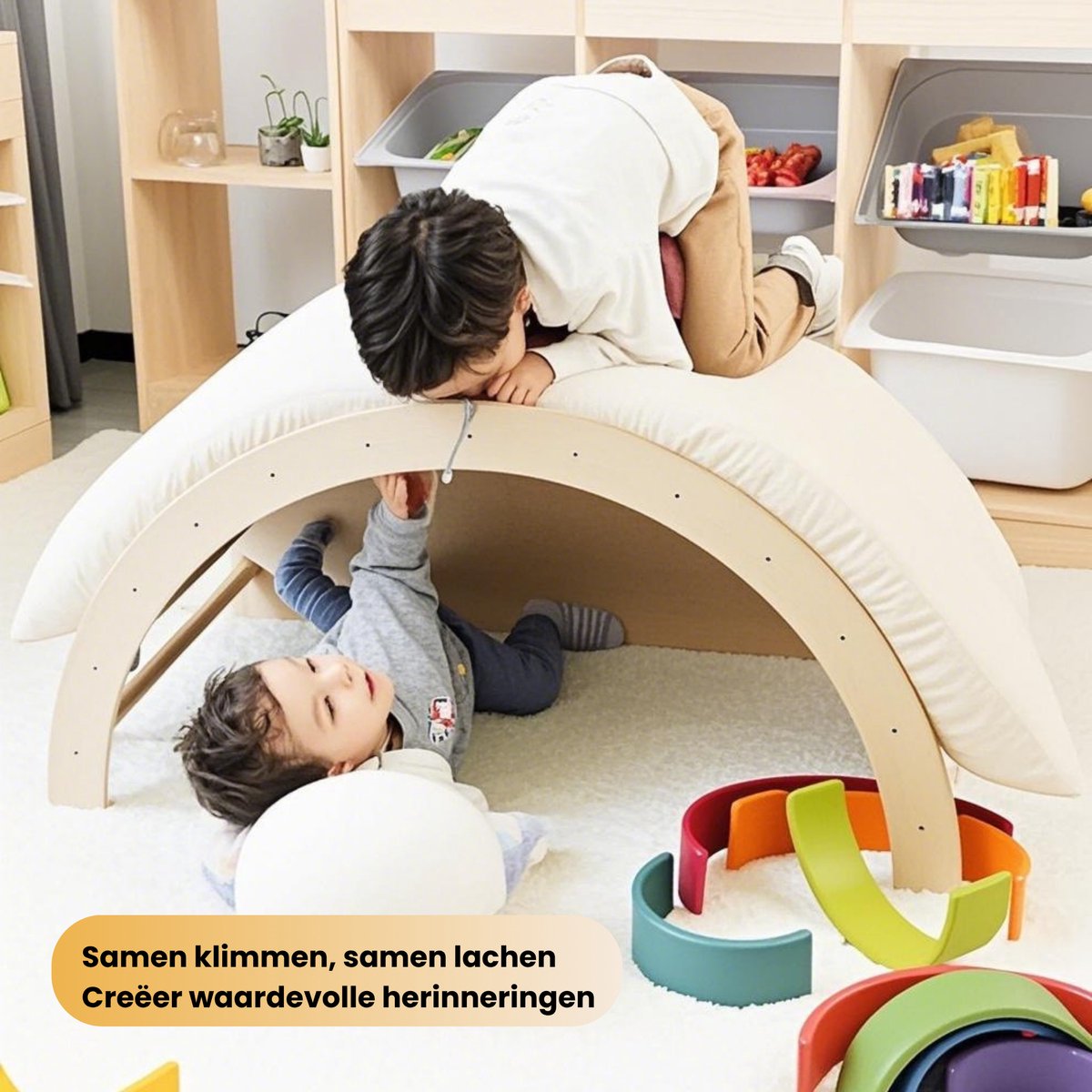 Overzicht:De WOBLI 5-in-1 Houten Klimboog is een veelzijdig Montessori-speelmeubel dat klimmen, schommelen en creatief spelen combineert; ideaal voor Nederlandse gezinnen die motoriek en zelfvertrouwen willen stimuleren. Dit veilige speeltoestel is geschikt vanaf 18 maanden.