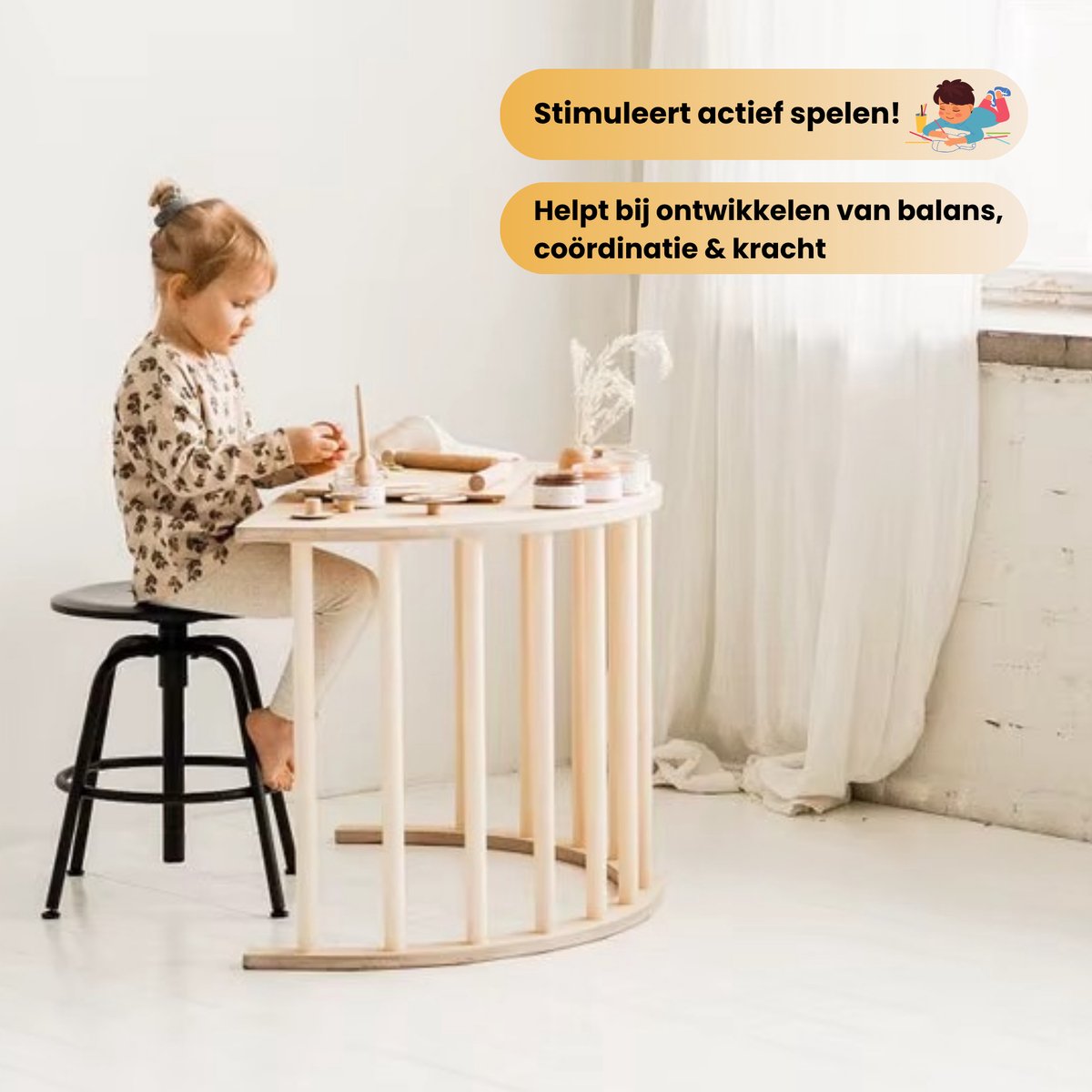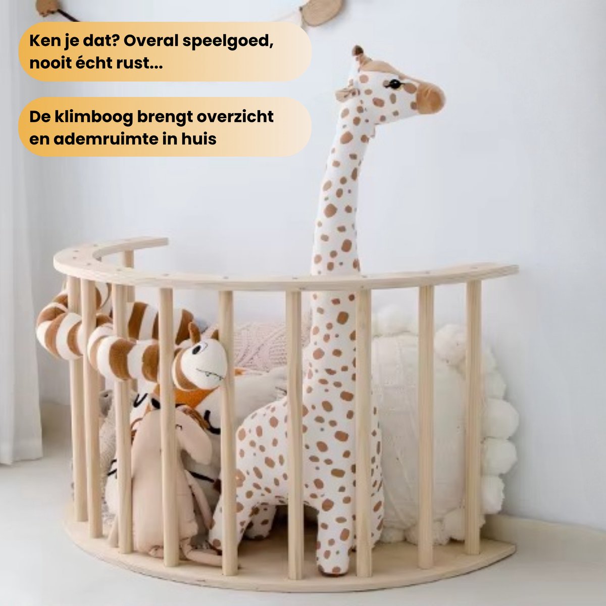 Deze veelzijdigheid betekent dat je één meubelstuk koopt dat meerdere speelsituaties dekt. In de praktijk bespaart dat ruimte en geld: je kind kan klimmen en balansoefeningen doen, rustig wiegen als schommelstoel, aan tafel kleuren of de boog gebruiken om speelgoed te organiseren. Dit maakt de klimboog geschikt voor zowel vrij spel als gerichte ontwikkelingsactiviteiten.