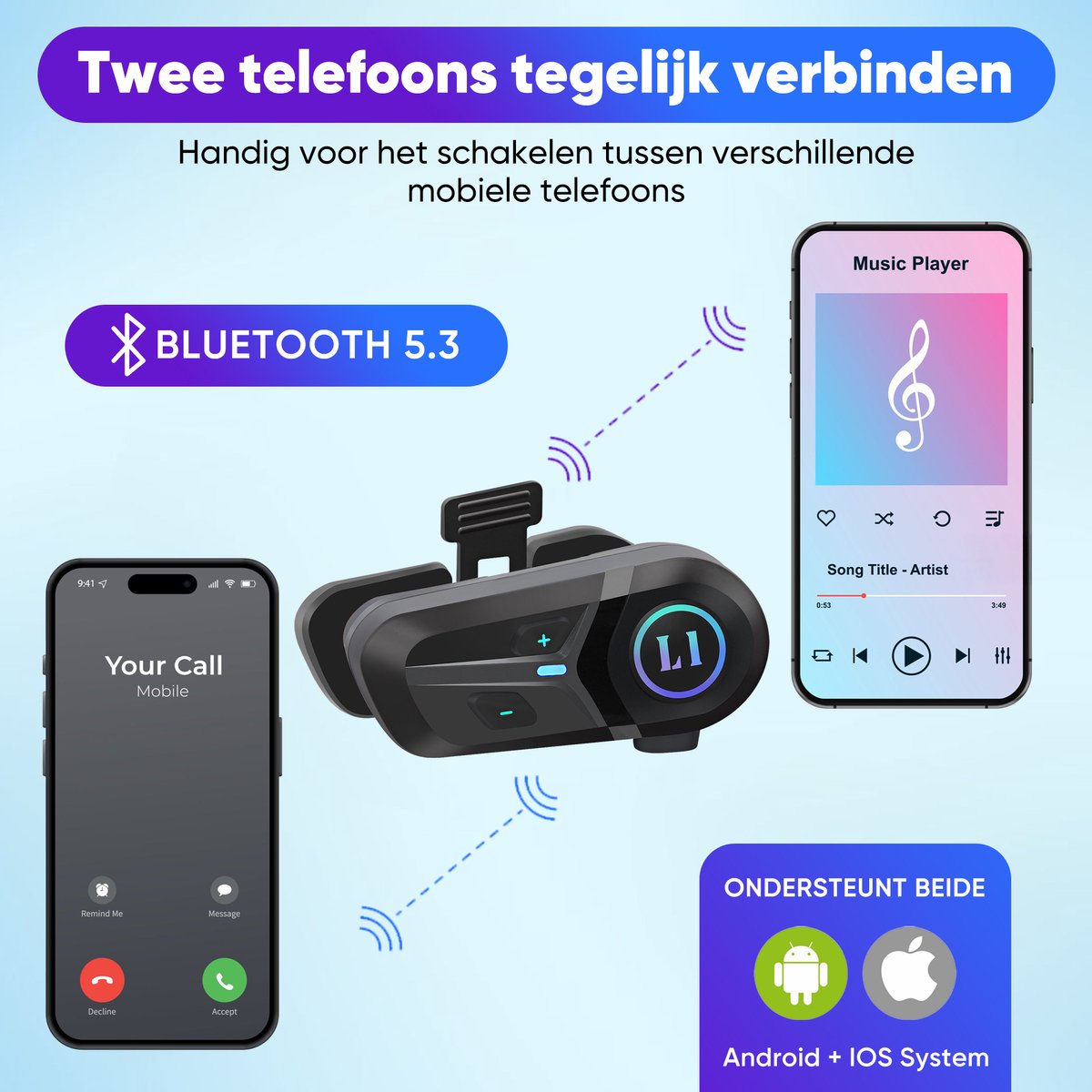 De headset koppelt met je telefoon via Bluetooth 5.3, wat stabielere verbinding en lagere latentie belooft vergeleken met oudere versies. Dit helpt vooral bij het synchroon luisteren naar navigatie en muziek, en draagt bij aan betrouwbare gespreksverbindingen tijdens het rijden (Bluetooth 5.3, éénmalig vermeld).