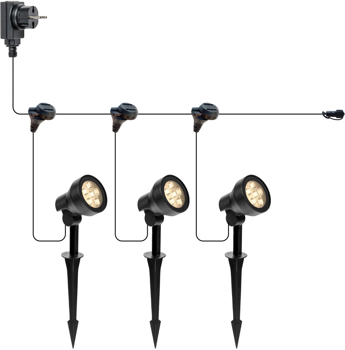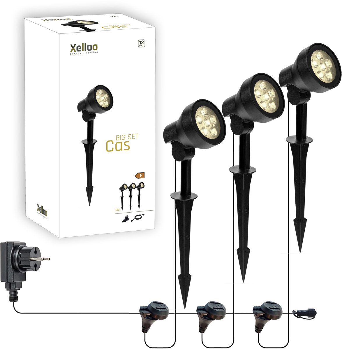De Xelloo CAS BIG tuinverlichting is een set van drie robuuste buitenarmaturen met warm wit LED-licht, ontworpen voor het verlichten van paden, gevels en borders. Het systeem werkt op veilige 12 volt laagspanning en gebruikt een slim schuifsysteem waarmee je de lampen zonder gereedschap op elke gewenste plek op de hoofdkabel vastklikt. Volgens de productvermelding verbruikt elke lamp slechts 4 watt en is de behuizing weerbestendig met IP44.