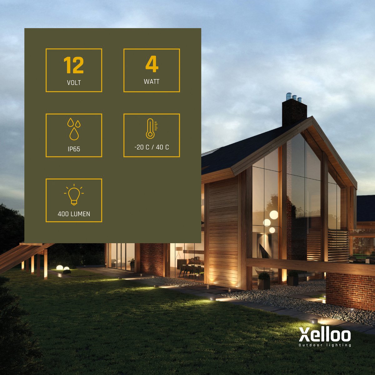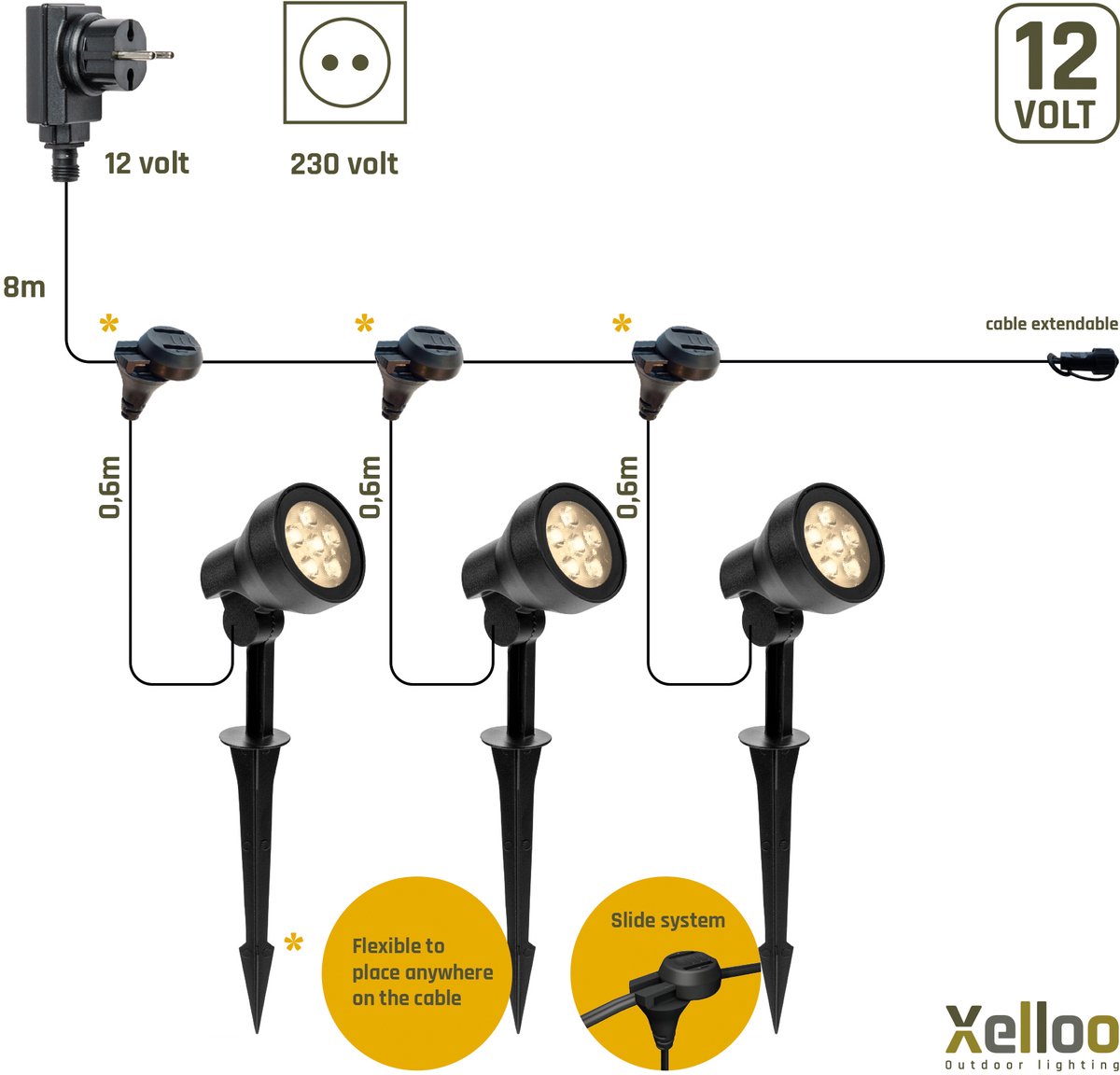 Of het systeem met extra lampen is uit te breiden of compatibel is met andere Xelloo componenten is niet gespecificeerd. Rekenkundig kun je bij 12V-systemen vaak uitbreiden zolang de transformator voldoende vermogen levert en spanningsval binnen de perken blijft, maar zonder duidelijke fabrieksinformatie is het verstandig dit vooraf bij de aanbieder te verifiëren. Let bij uitbreiden altijd op: