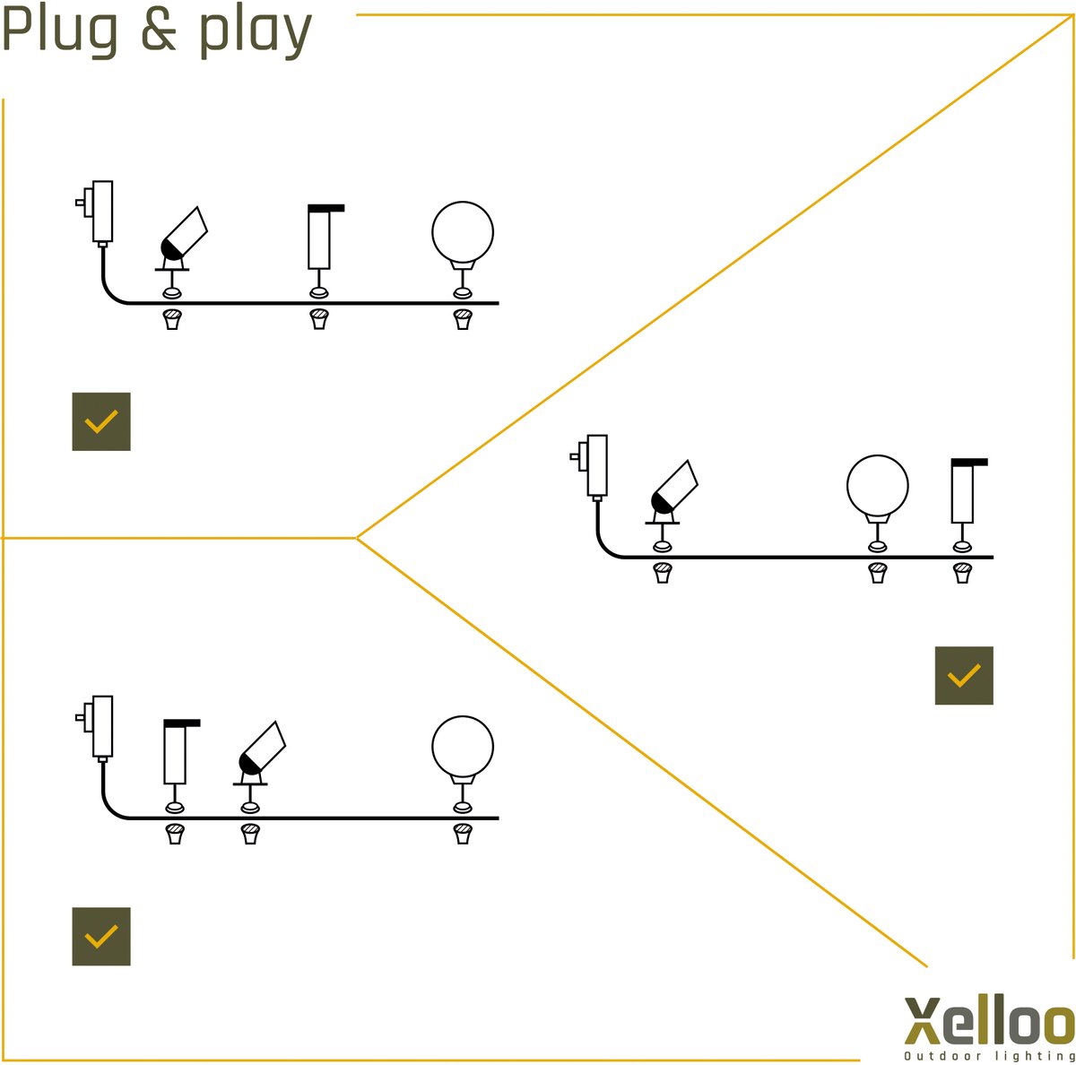 De opbouw van het systeem is gericht op eenvoud: een 8 meter lange hoofdkabel en het schuifsysteem van Xelloo. Geen gedoe met strippen, kroonsteentjes of schroeven; je schuift de connector op de kabel en fixeert de lamp. Dat maakt ook het kabelbeheer makkelijker: laat de hoofdkabel langs de rand van het pad lopen, onder de randstenen of licht ingegraven, en schuif op de gewenste punten een lamp erop.