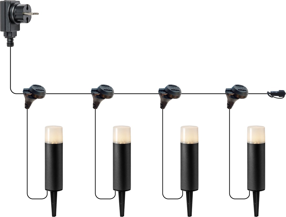 De meegeleverde hoofdkabel is 8 meter lang (volgens de productinformatie). Daarmee leg je een basistracé vanaf het stopcontact of de transformator langs de plekken die je wilt verlichten. Het schuifsysteem maakt aftakken op maat mogelijk. Praktisch: