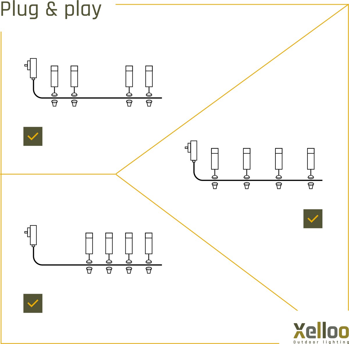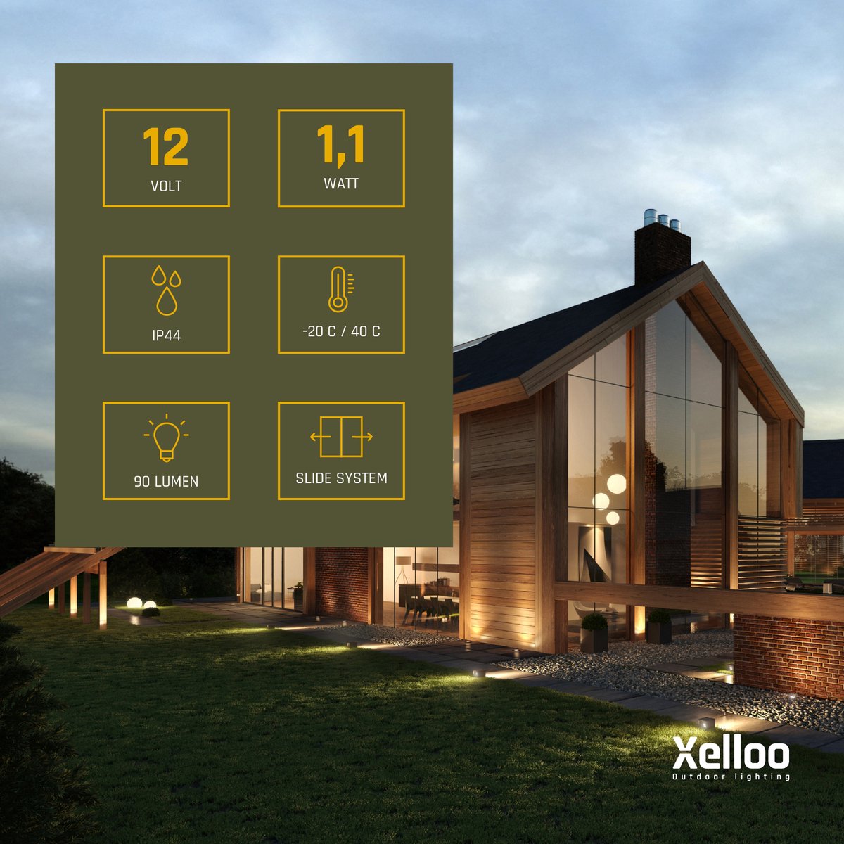 Alle Xelloo producten werken met 12 volt laagspanning. Dat maakt de installatie extra veilig in vochtige buitenomgevingen en prettig voor gezinnen met kinderen of huisdieren. Je kunt kabels gerust langs borders of onder mulch leiden zonder het risico van gevaarlijke spanning.