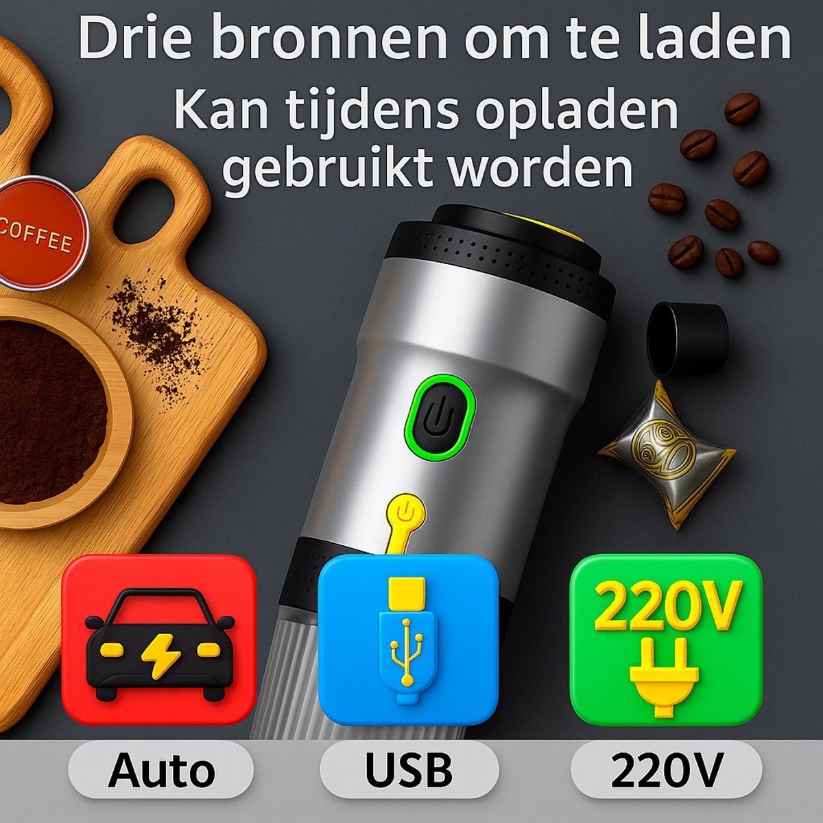 Overzicht:Het draagbare koffiezetapparaat van Yemtech is een compact drie-in-een apparaat, ideaal voor Nederlandse koffieliefhebbers die onderweg kwaliteit willen. Met een 7500 mAh-accu en compatibiliteit met Nespresso® en Dolce Gusto® capsules zet je onderweg espresso, lungo of cappuccino.