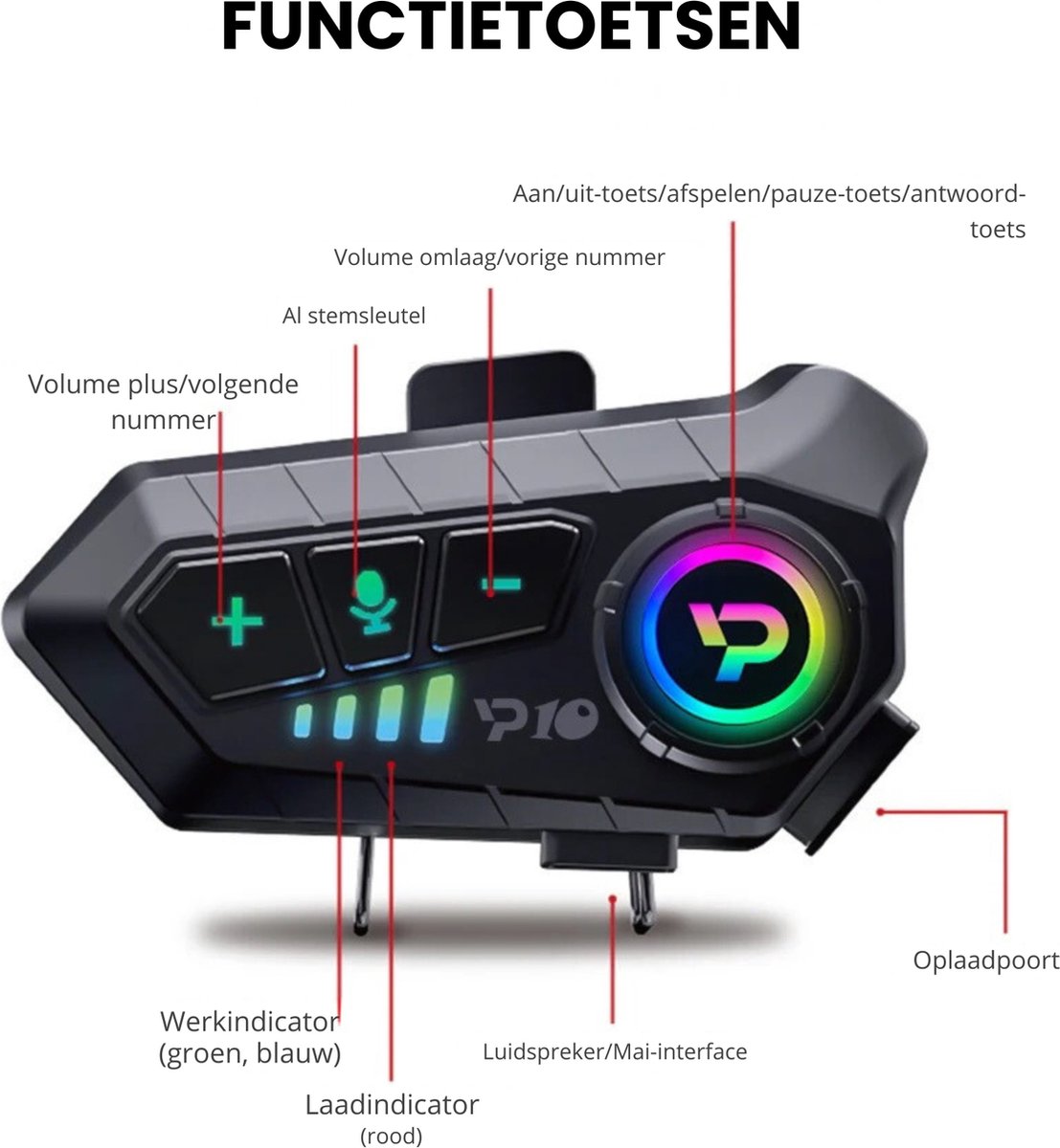 Ontworpen voor eenvoudig gebruik onder een helm — handig voor motorrijders en fietsers | Oplaadtijd en batterijcapaciteit (mAh) niet vermeld |