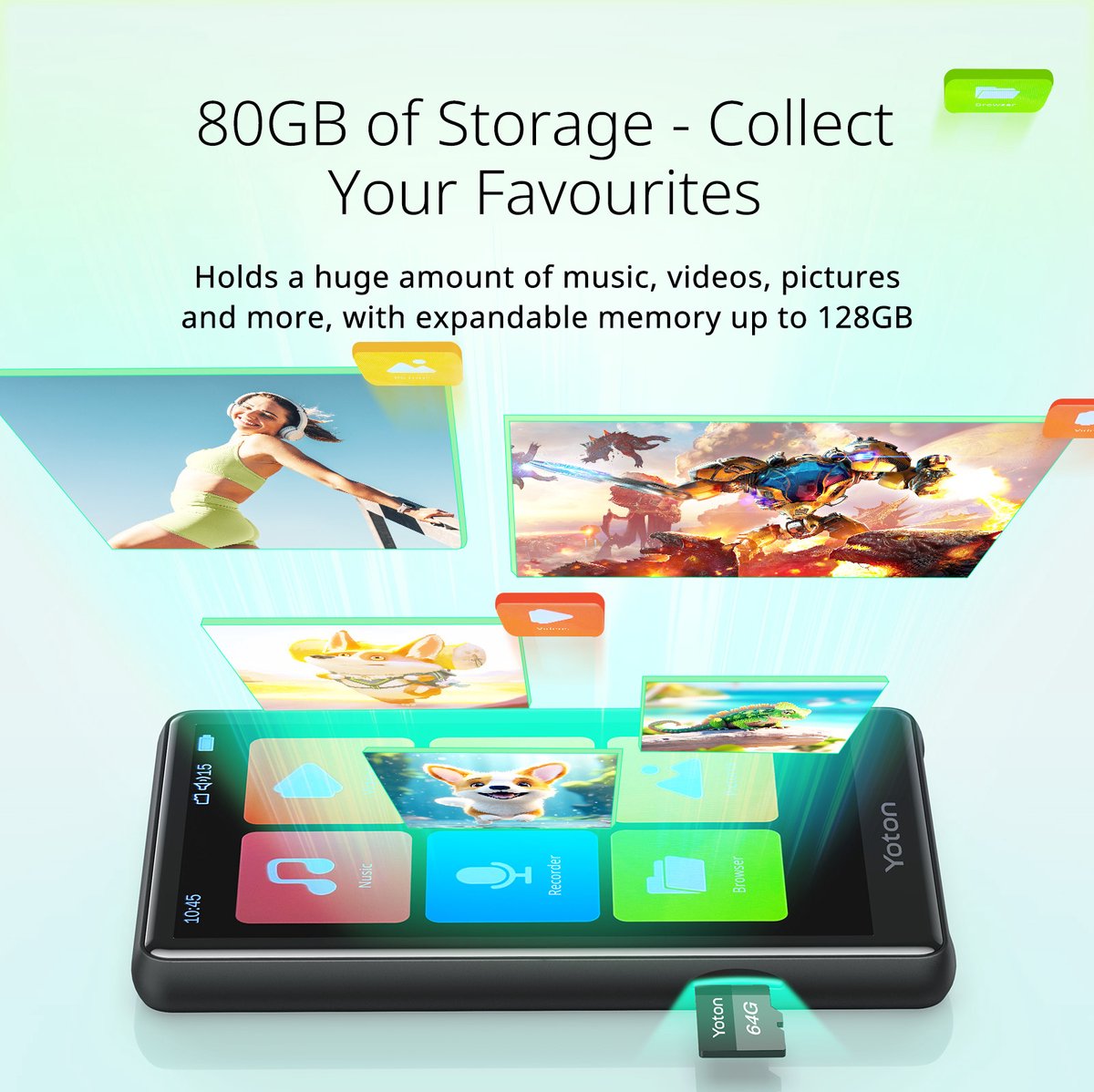 Overzicht:De Yoton MP3-speler YM06 is een alles-in-één muziek- en videospeler, ideaal voor Nederlandse gebruikers die veel media willen meenemen. Met 80 GB opslagcapaciteit (16 GB ingebouwd, 64 GB geheugenkaart) bewaart u duizenden nummers en tientallen video’s onderweg.