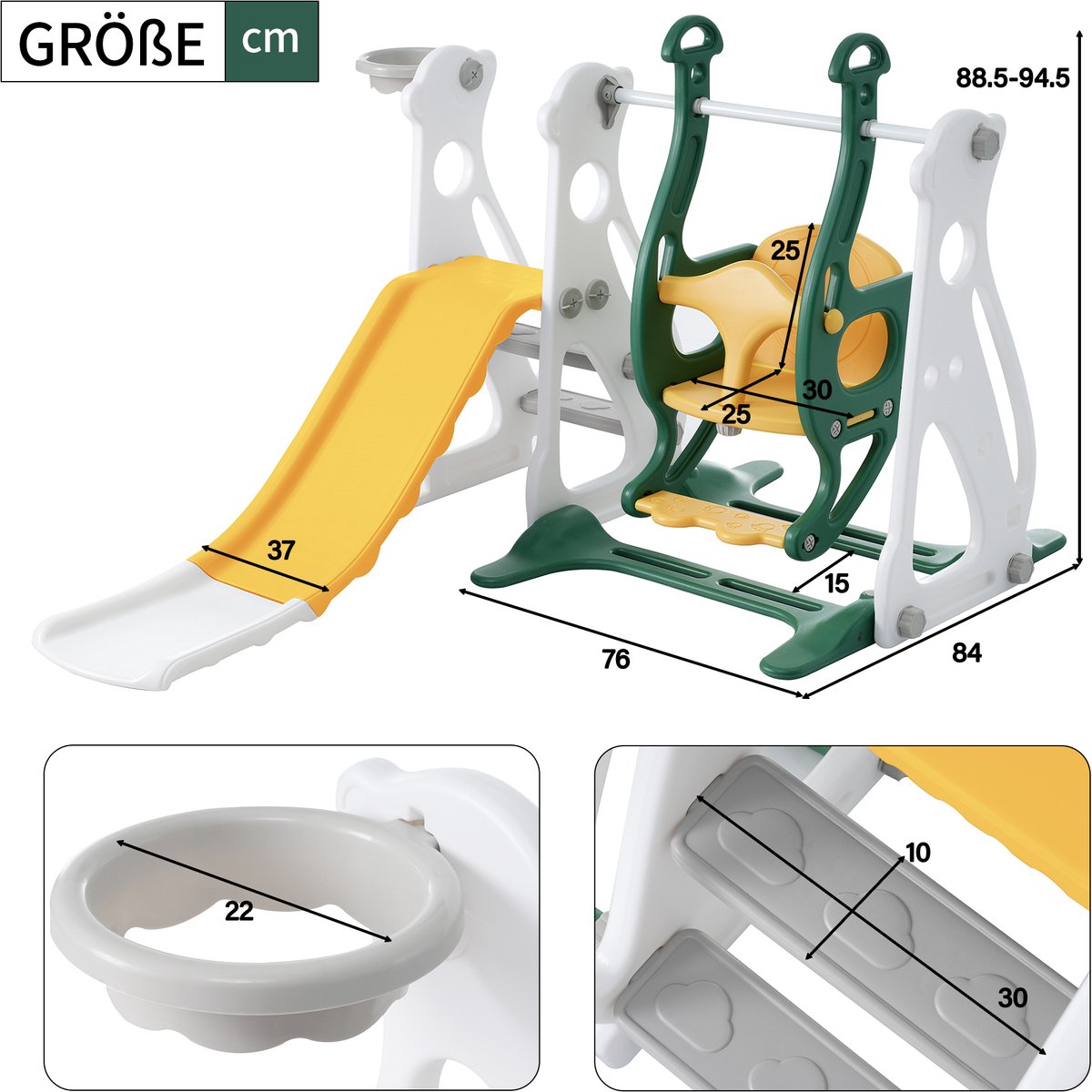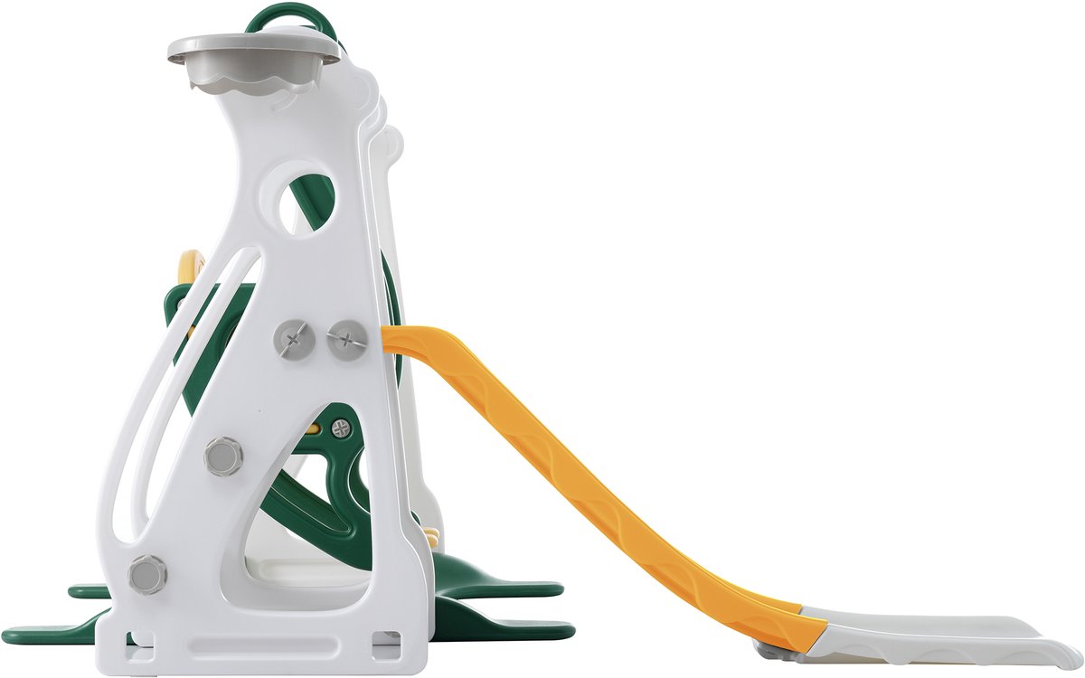 - Geniet van veelzijdig speelplezier dankzij glijbaan, schommel, klimladder en basketbalring.