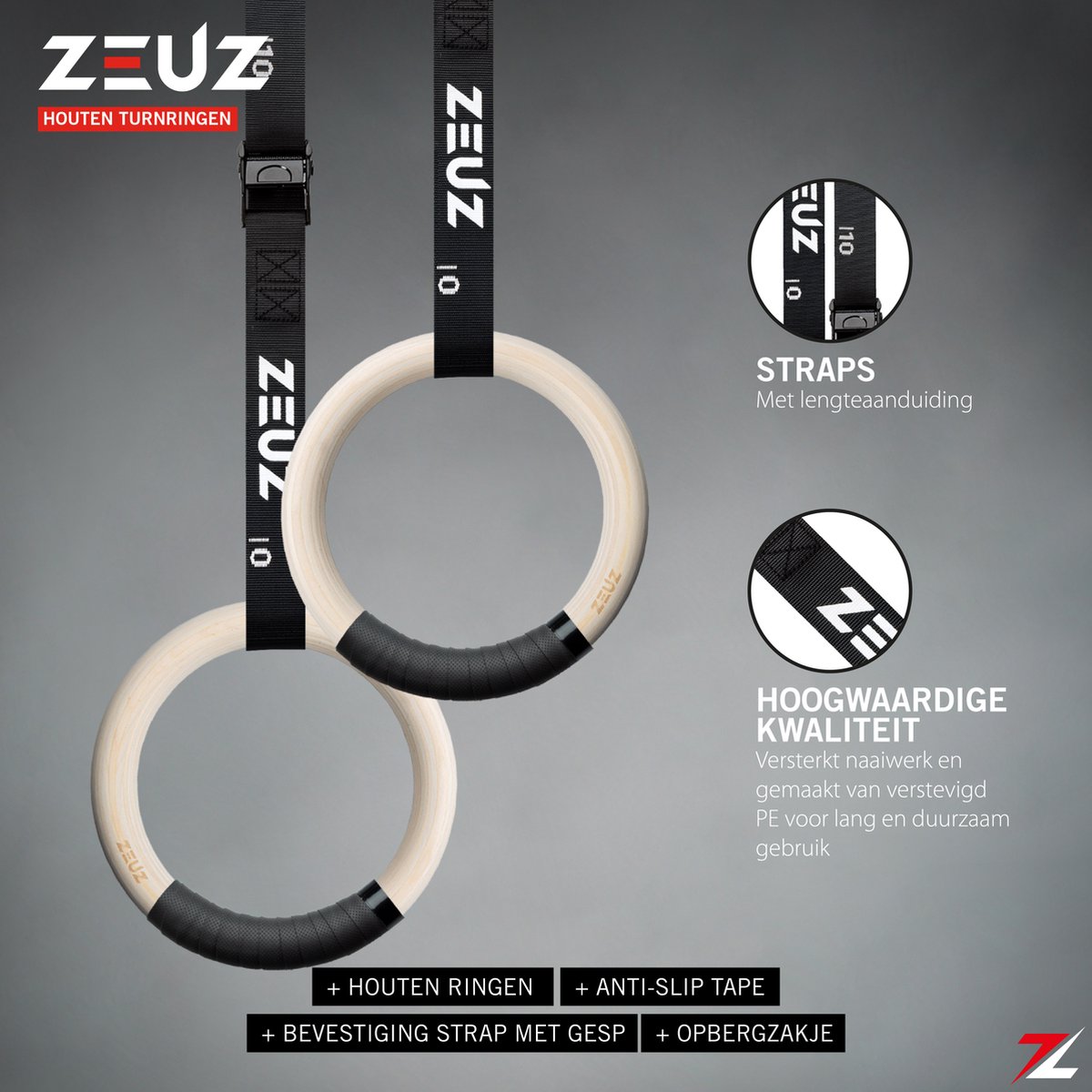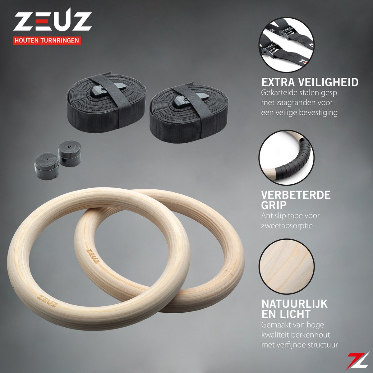 Overzicht:De ZEUZ® turnringen zijn een complete set houten ringen voor krachttraining thuis, buiten of in de sportschool in Nederland. Gemaakt van hoogwaardig berkenhout bieden ze stevige grip en duurzaamheid.