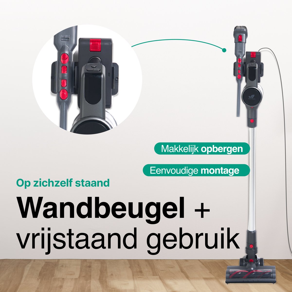 De meegeleverde ophangbeugel zorgt voor een vaste plek in de bijkeuken, gang of berging. Dat is niet alleen netjes, het verkleint ook de kans op valpartijen en zorgt dat je de steelstofzuiger sneller pakt bij kleine ongelukjes zoals omgevallen kruimels of zand bij de voordeur.