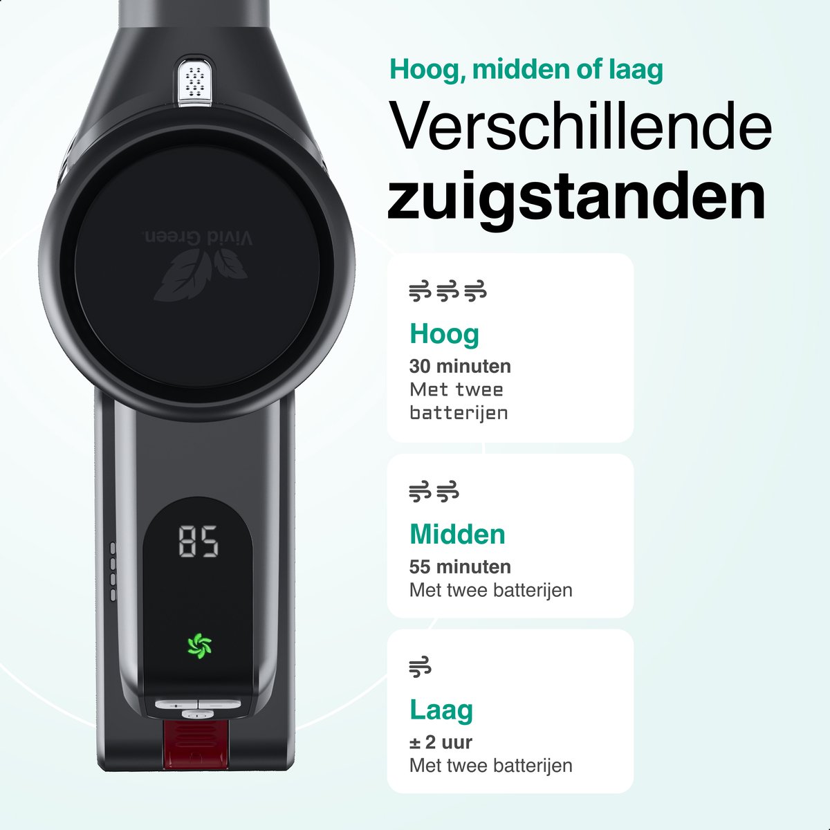 De Vivid Green Steelstofzuiger is een draadloze steelstofzuiger met extra accu, ideaal voor Nederlandse huishoudens die zonder onderbrekingen willen schoonmaken. Met een 1 liter stofreservoir en slimme opzetstukken verwijder je vuil, stof en haren op verschillende vloeren.