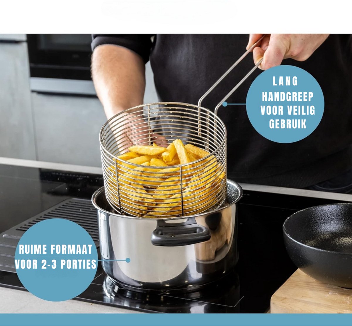 Er is een mandje voor het frituren dat in de pan past en een deksel om spatvorming te beperken. De RVS-afwerking in combinatie met het mandje maakt de pan geschikt voor uitgebreid huishoudelijk gebruik en eenvoudig reiniging, waarbij vaatwasserbestendigheid wordt genoemd (bron: listing, gecontroleerd 2025).